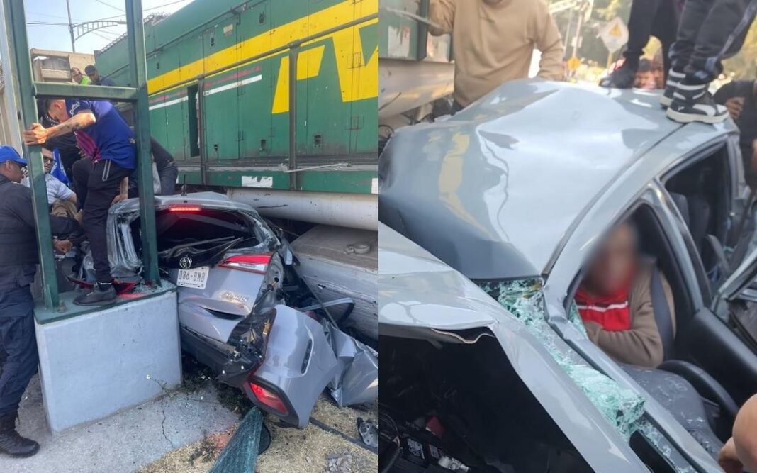 La mañana del martes, un adulto mayor intentó ganarle el paso a un tren en el cruce de avenida Ferrocarril Hidalgo con Circuito Interior, colonia 7 de Noviembre, alcaldía Gustavo A. Madero, Ciudad de México. El tren no detuvo su marcha y chocó contra el auto compacto que quedó prensado contra la base de un poste.