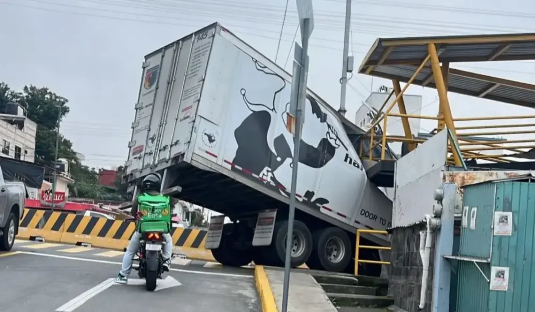 Un tráiler cargado con productos de Nestlé se atoró este viernes al mediodía en el puente de la Pomona, ubicado en la intersección de Lázaro Cárdenas y la calle Veracruz, en Xalapa. El conductor realizó una vuelta inadecuada que provocó que la caja del tráiler colisionara con la estructura del puente.